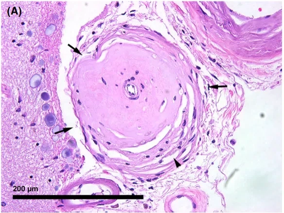 黒矢印のところが血管ですが、ピンク色のコラーゲンがたまり、「動脈」の壁が分厚くなって硬くなっていることがわかります。