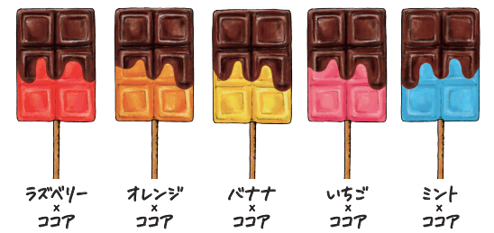 「チョコがけ」のテーマに合わせカラフルな板チョコロリポップが登場します。フルーツ味をベースとしながらも、製法に工夫を加え、チョコレート部分はチョコのフレーバーも楽しめるオリジナルのキャンディが完成しました。