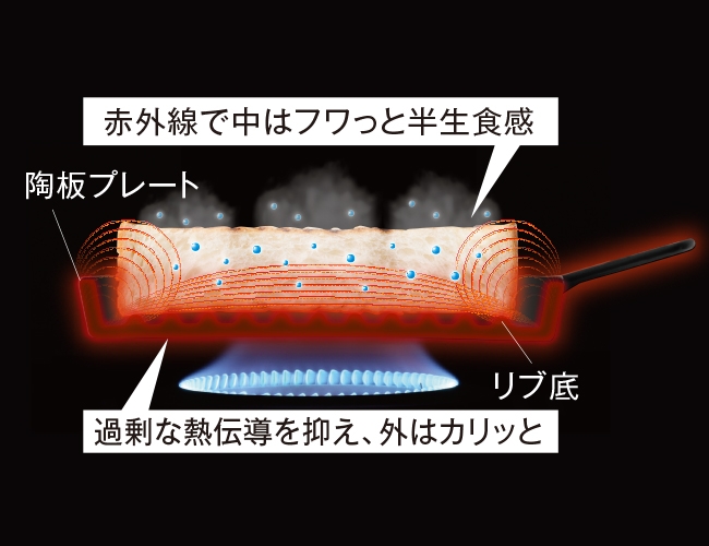 高温に加熱された陶板でパンの表面を素早く焼くことで外はカリっと焼き上げ、パンの中は遠赤外線によって温められます。遠赤外線に熱自体はないのでパン本来の水分は内側に閉じ込められます。この特性により、パンへの過剰な熱伝導が抑えられ、外はカリっと中はふわっとした口どけの良いパンに仕上がります。