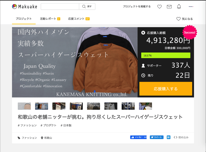 国内外ハイメゾン実績多数の和歌山、老舗ニッターが挑む。 「Makuake(マクアケ)」にて、 “Suvin Recycle Organic High Gauge Sweat” 11/21に先行発売中。 目標金額の1600%を達成。サポーター1000名を目指す。