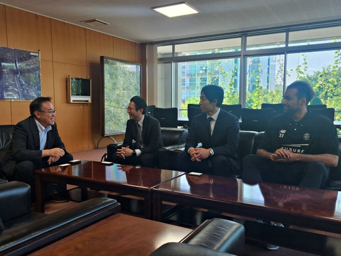 訪問者:ジークスタースポーツエンターテインメント株式会社 代表取締役社長 黒田 真一、ジークスター東京 監督 佐藤 智仁、キャプテン 玉川 裕康