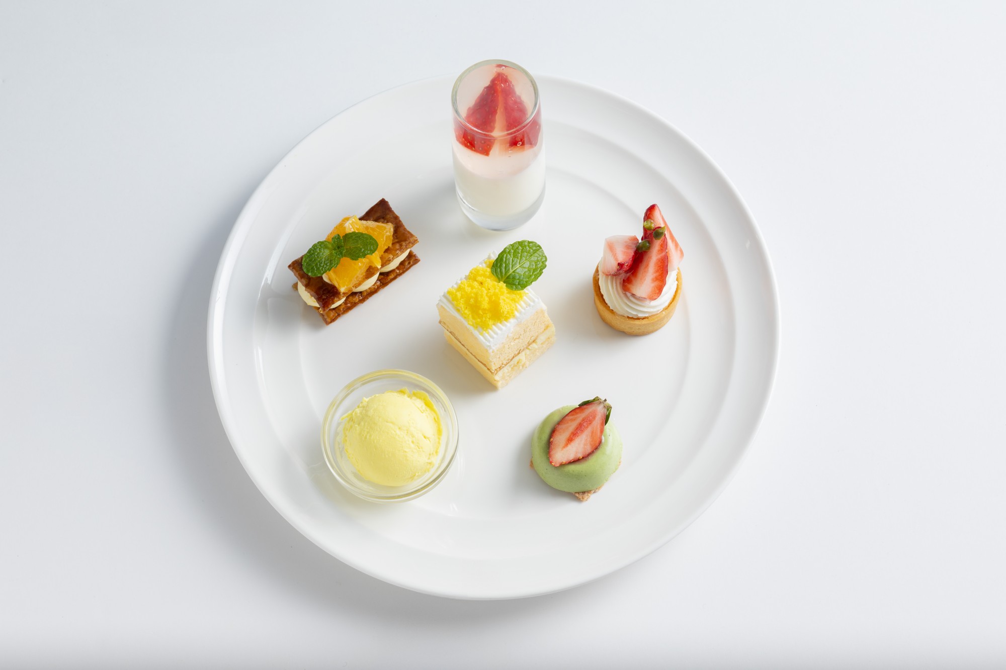 お好きなケーキ、ライチと杏仁のヴェリーヌ、いちごのフロマージュタルト、レモンのミモザケーキ、抹茶のムース、日向夏シャーベット、オレンジのミルフィーユ、ライチと杏仁のヴェリーヌ