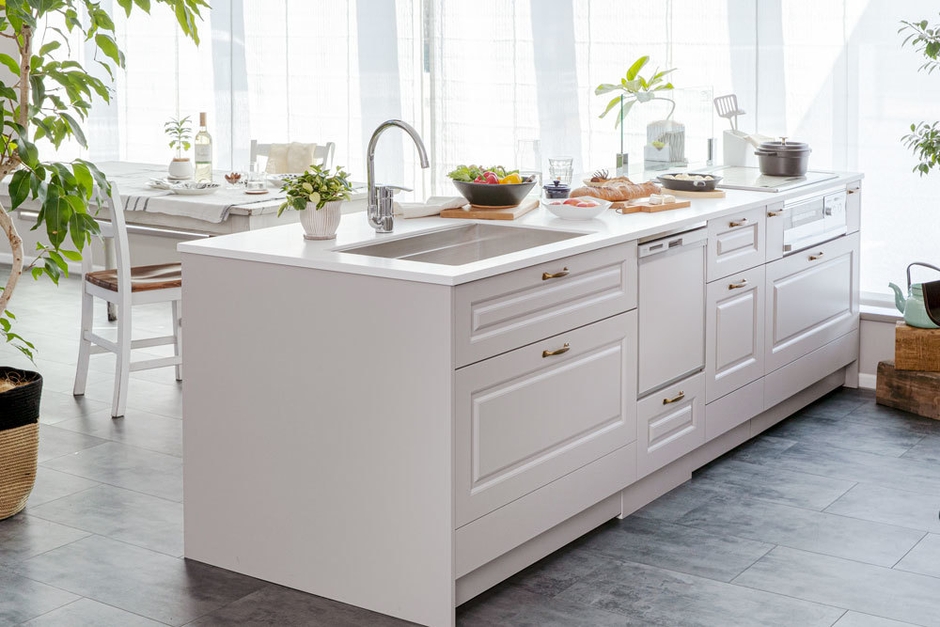 扉は框組のような凹凸をつけ、クラシックな装いに。塗装色はくすみ系のニュアンスカラー5色から選択可。ワークトップ(14種)やハンドル(6種)の組み合わせで幅広いデザインを実現します。