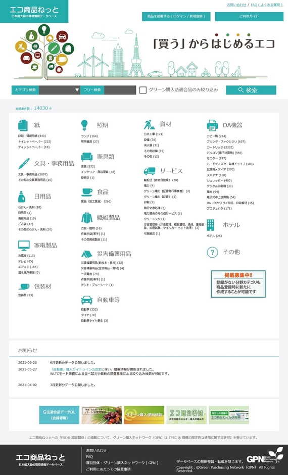 グリーン購入ネットワーク(GPN)(事務局:東京都千代田区、会長:梅田 靖)は、製品やサービスの環境情報と事業者の環境面・社会面の取り組みに関する国内最大級のデータベース「エコ商品ねっと」( https://www.gpn.jp/econet/ )の掲載情報を更新しました。