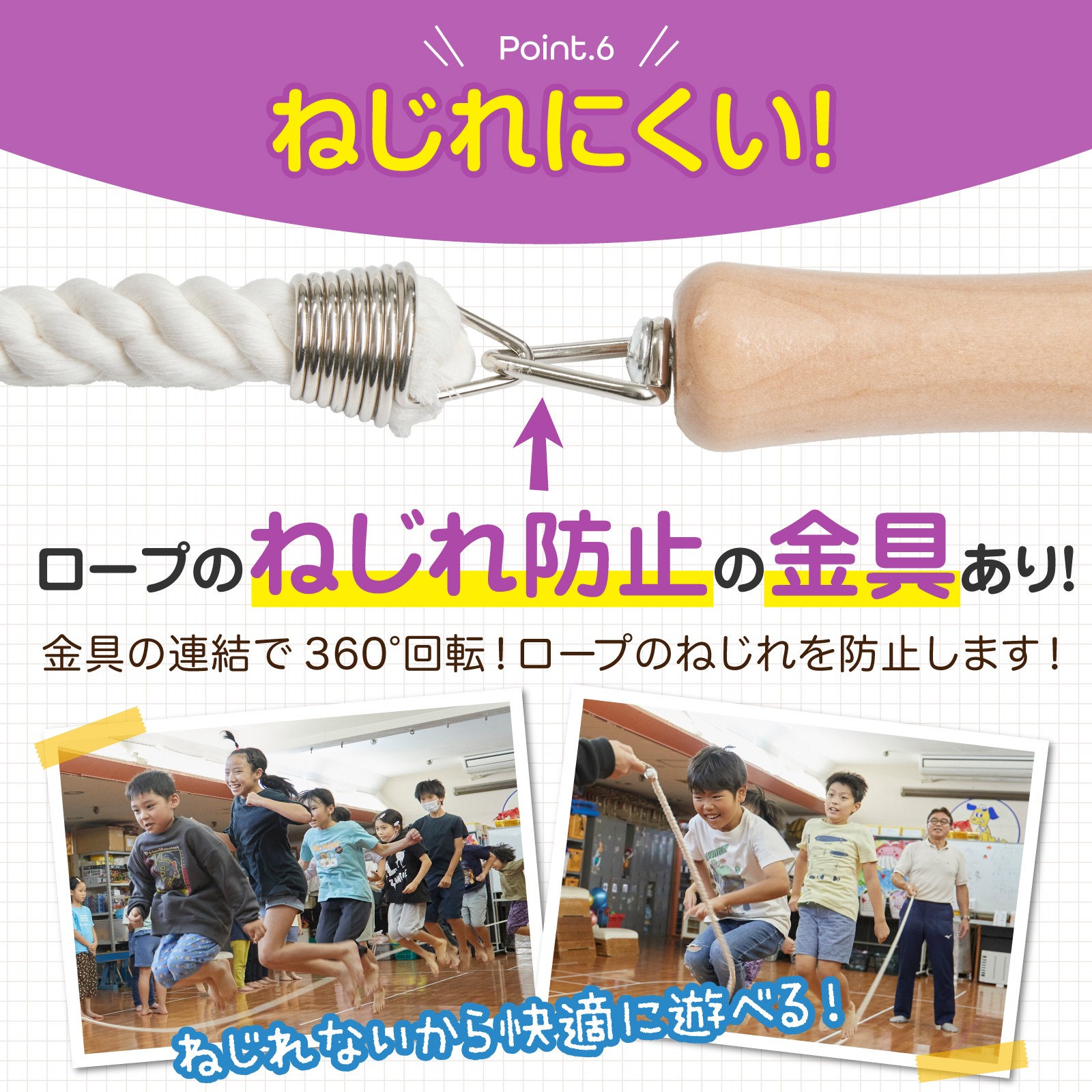 大縄跳び特有の「ロープのねじれ」を防止し、途中で絡まることなく快適に遊び続けることができます。