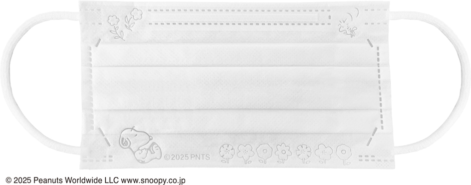 今作は自然をテーマにしたデザインとなっております。マスク本体にはお花畑の中でまどろむスヌーピーがエンボスデザインで施されており、穏やかな時間を演出しています。さりげない小さなお花とウッドストックもいます。スリーブボックスなので、普段使いと収納にも便利です。取り出す際にもかわいい要素が満載の箱のデザインも是非楽しんでください。