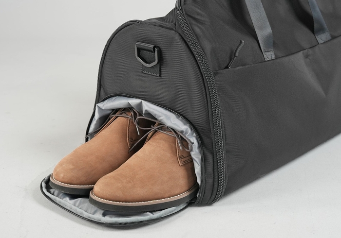 ダッフルバッグ:革靴も入る防水シューズポケット。