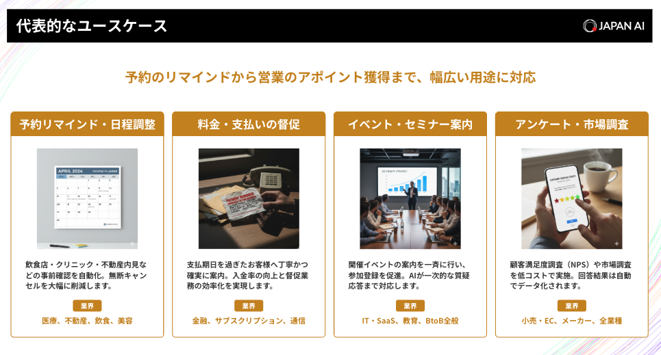 株式会社ジーニー(本社:東京都新宿区、代表取締役社長:工藤 智昭、以下ジーニー)のグループ会社である、AIを活用したプロダクト開発・販売を行うJAPAN AI株式会社(本社:東京都新宿区、代表取締役社長:工藤 智昭、以下JAPAN AI)は、架電業務を自動化するAIオペレーター「JAPAN AI CALL」の提供を開始いたしました。本サービスにより、従来人的リソースに依存していた架電業務の自動化を実現し、企業の営業組織やコールセンター等の生産性向上と人手不足の解決に貢献いたします。