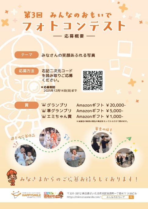 写真販売プラットフォームサービス「みんなのおもいで .com」(https://minnanoomoide.com/、以下本サービス)を運営している株式会社ハッピースマイル(本社:埼玉県さいたま市、代表取締役社長兼CEO:佐藤堅一)は、「第3回 みんなのおもいでフォトコンテスト」を開催いたします。本コンテストでは「みなさんの笑顔あふれる写真」をテーマに、とっておきの笑顔の瞬間を募集します。