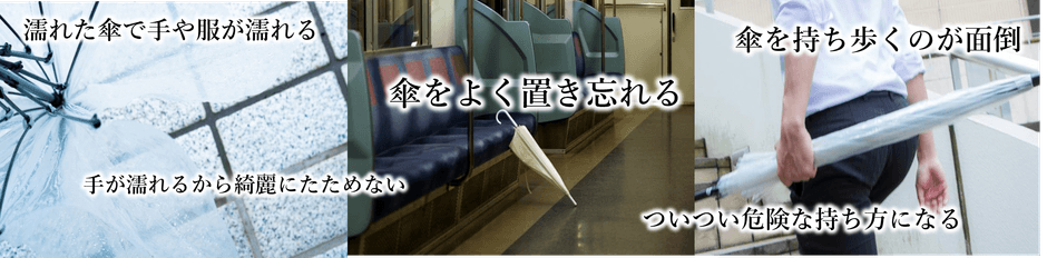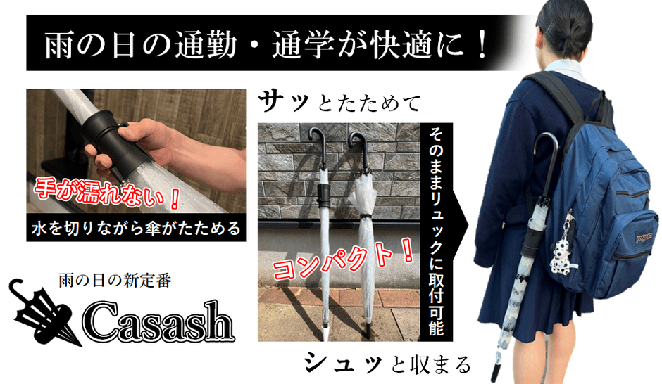Casashは、濡れた傘を「たたむ時」「持ち歩く時」の不快感を解消し、雨の日の外出を快適にする商品です。