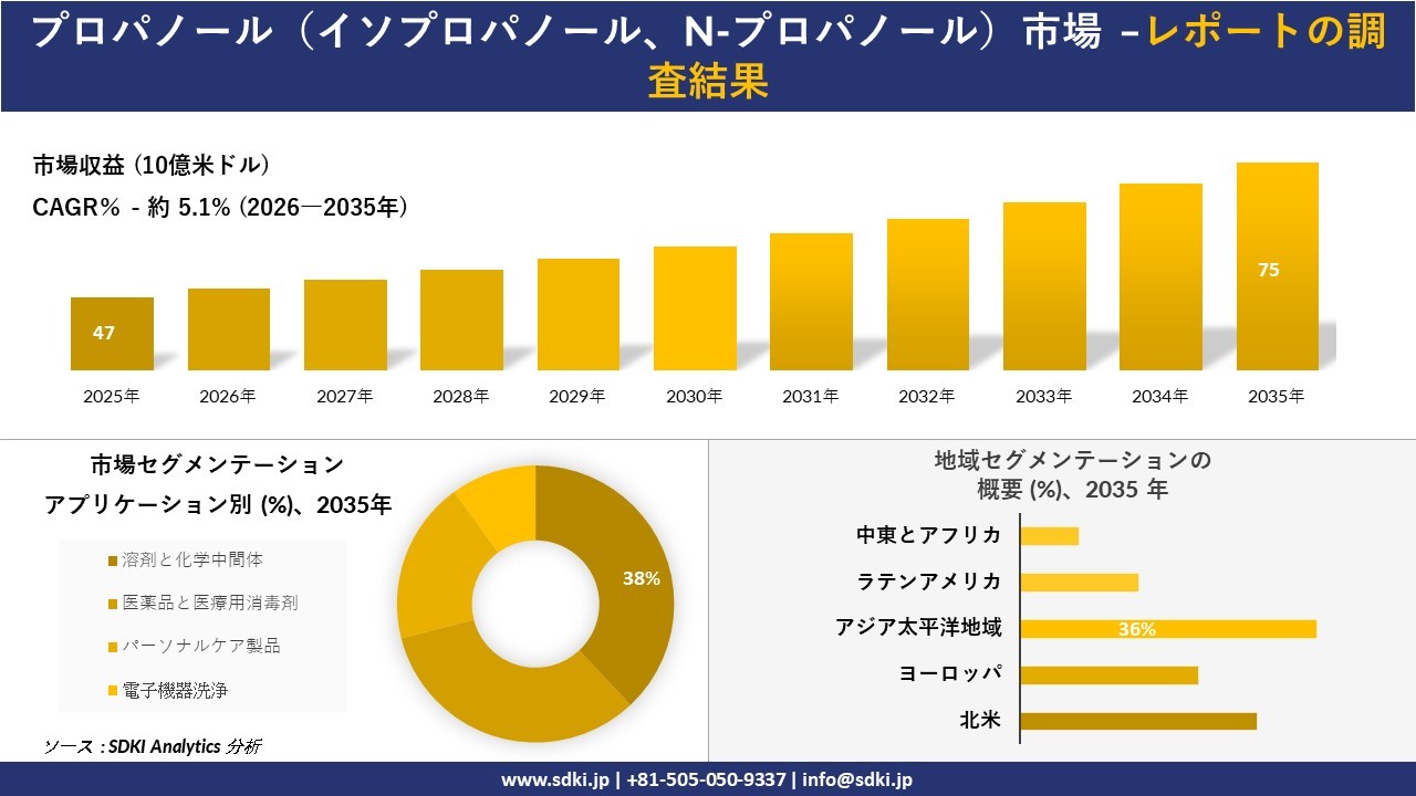 提出日 (2026年03月24)、SDKI Analytics(本社:渋谷区、東京都)は、2026年と2035年の予測期間を対象とした「プロパノール(イソプロパノール、N-プロパノール)市場」に関する調査を実施しました。