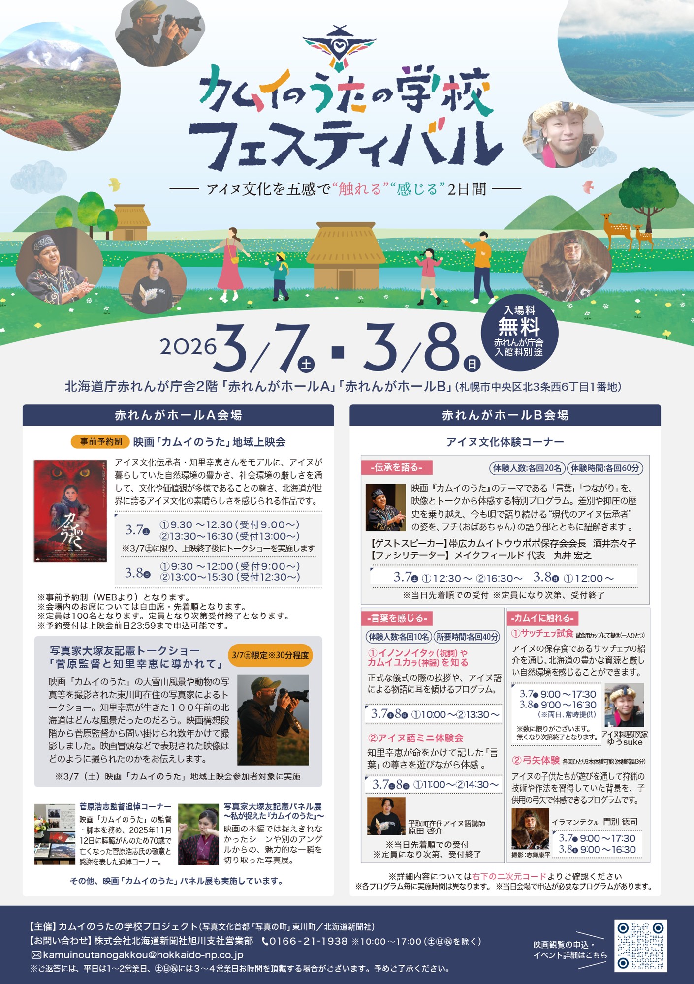 アイヌ文化伝承者・知里幸恵さんをモデルに、北海道が世界に誇るアイヌ文化の素晴らしさを感じられる映画「カムイのうた」の地域上映会に加え、映画で描かれる、アイヌの文化(アイヌ語・ユカラ)や暮らし(食・狩り)、北海道の豊かな自然を五感で気軽に触れられる体験イベントも同時開催いたします。