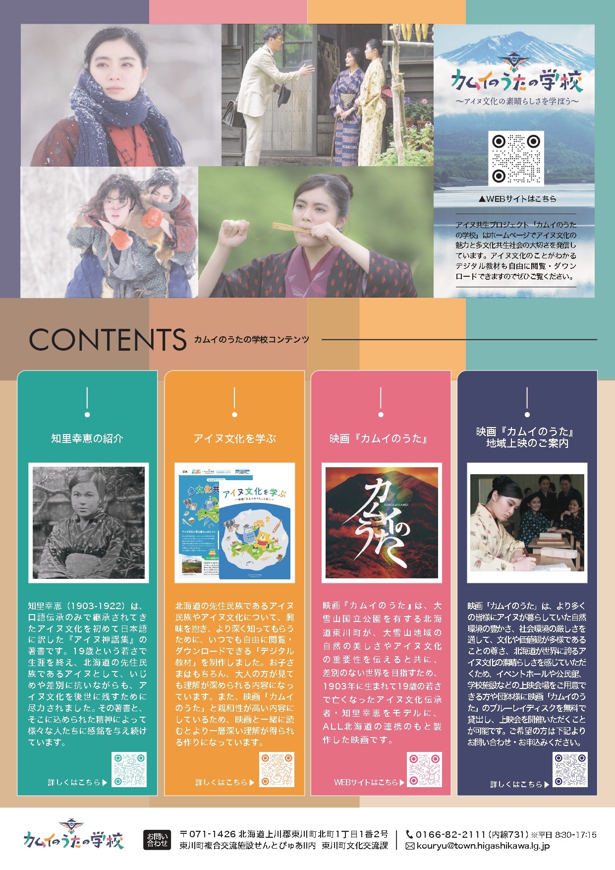 北海道東川町では、多様な文化と国内外の交流を推進し、多文化共生のまちづくりに取り組んでいます。その一環として、2023年には大雪山文化と、大雪山のふところで生きるアイヌの文化を広めるとともに、差別のない世界(=多文化共生社会)を次世代に伝えることを目的に、東川町とさまざまな機関・団体と連携して“オール北海道”で作り上げた映画「カムイのうた」を製作。2024年にその映画に込められた想いを、若い世代をはじめより多くの方に気軽に触れていただけるよう、㈱北海道新聞社と連携してアイヌ共生プロジェクト「カムイのうたの学校」を発足し、多文化共生社会の実現と継承に取り組んでいきます。