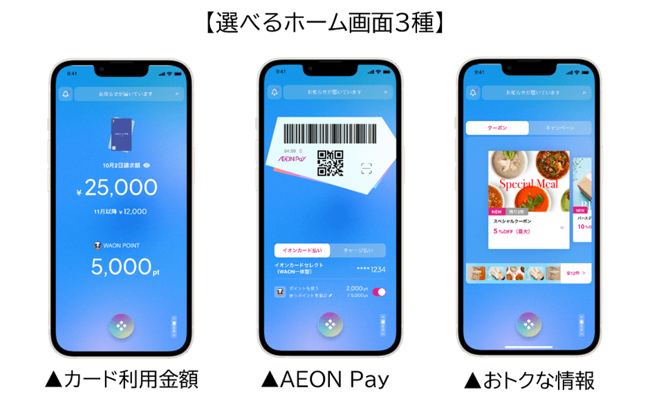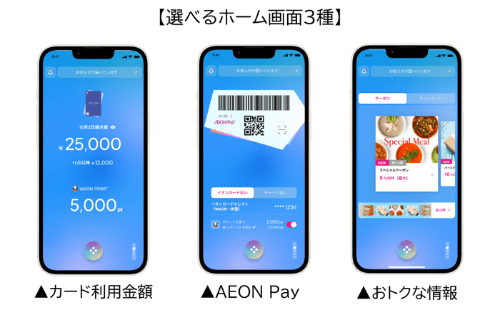 このたびのリニューアルにより、イオンカードをお持ちでないお客さまも「イオンウォレット」にご登録いただくことで、「AEON Payチャージ払い」「クーポン」「キャンペーン応募」等の機能をご利用いただけるようにいたしました。さらに、デザインはシンプルで見やすく、クーポンやキャンペーンの画面も探しやすいよう操作性と視認性を向上させるとともに、一人ひとりの利用したい機能に応じてホーム画面の選択・カスタマイズを可能といたしました。