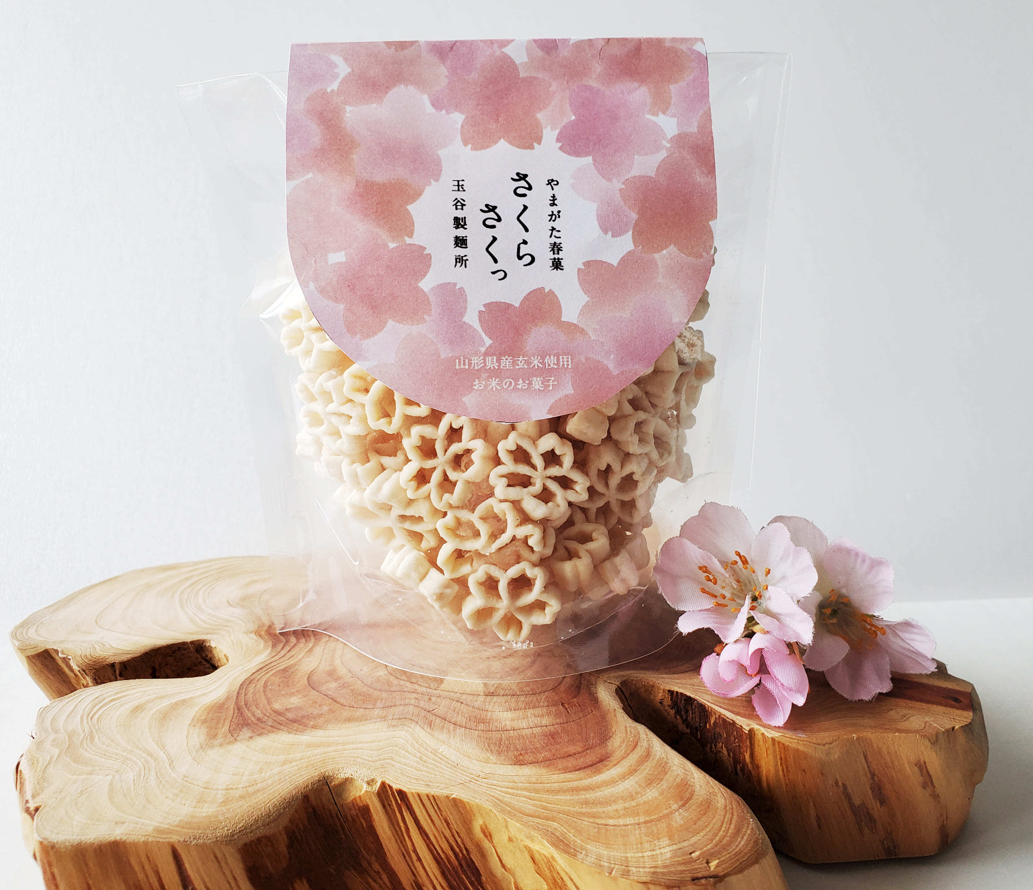 『山形春菓 さくらさくっ』は、「桜」を象ったパスタスナックです。小麦粉不使用。山形県産米とでんぷんで作ったパスタを素揚げし、きび砂糖と天然塩で味付け。あられのように優しい味が、勉強の合間のリフレッシュに楽しめます。