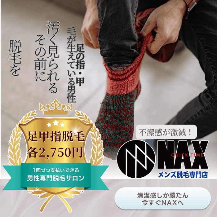 メンズ脱毛サロンNAXでは、足の甲や指の脱毛をリーズナブルな価格で提供しています。長くて不快なムダ毛を取り除き、清潔感と快適さを手に入れるチャンスです。プロの技術で、自信に満ちた足元を手に入れましょう!まずはお気軽にお問い合わせください。