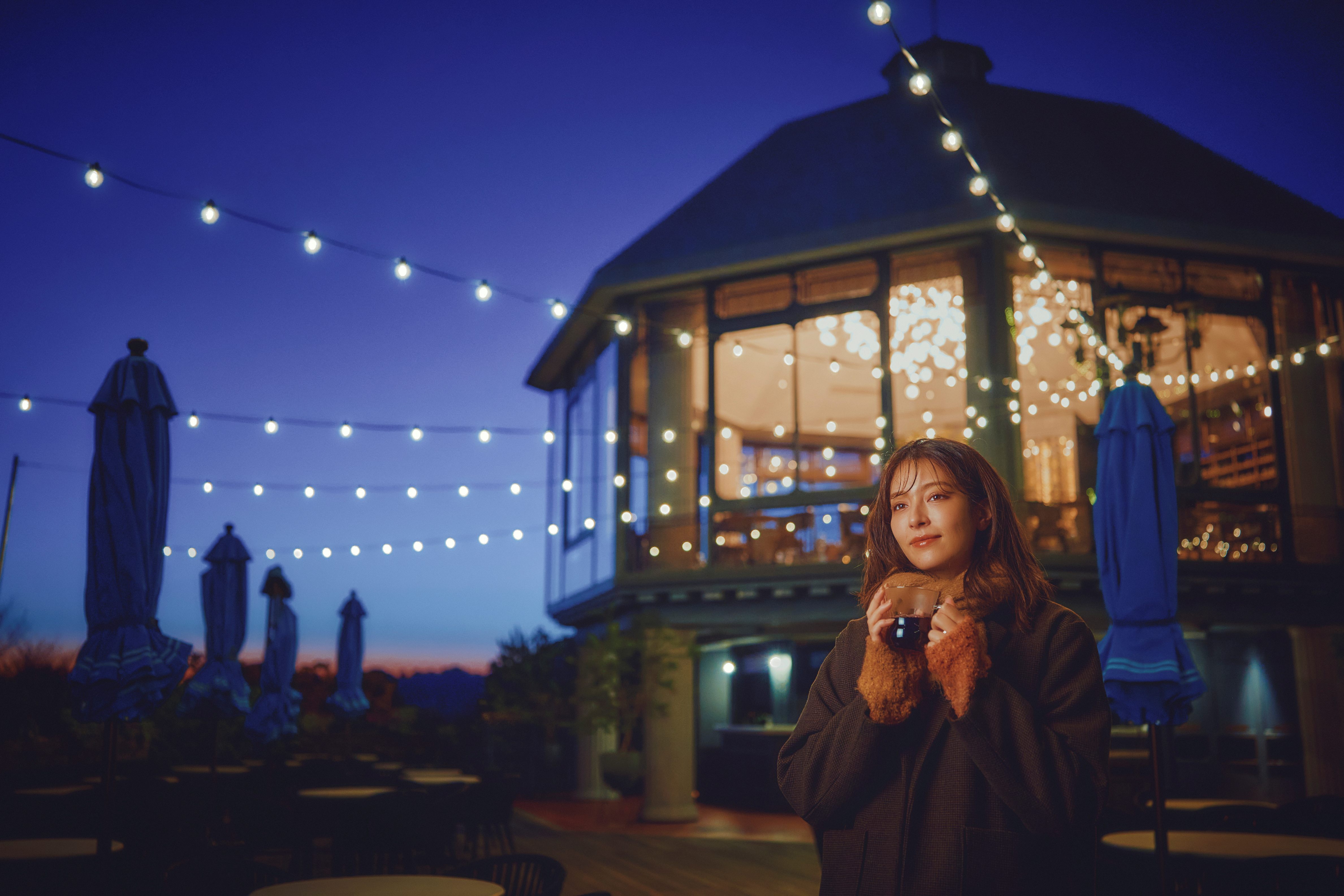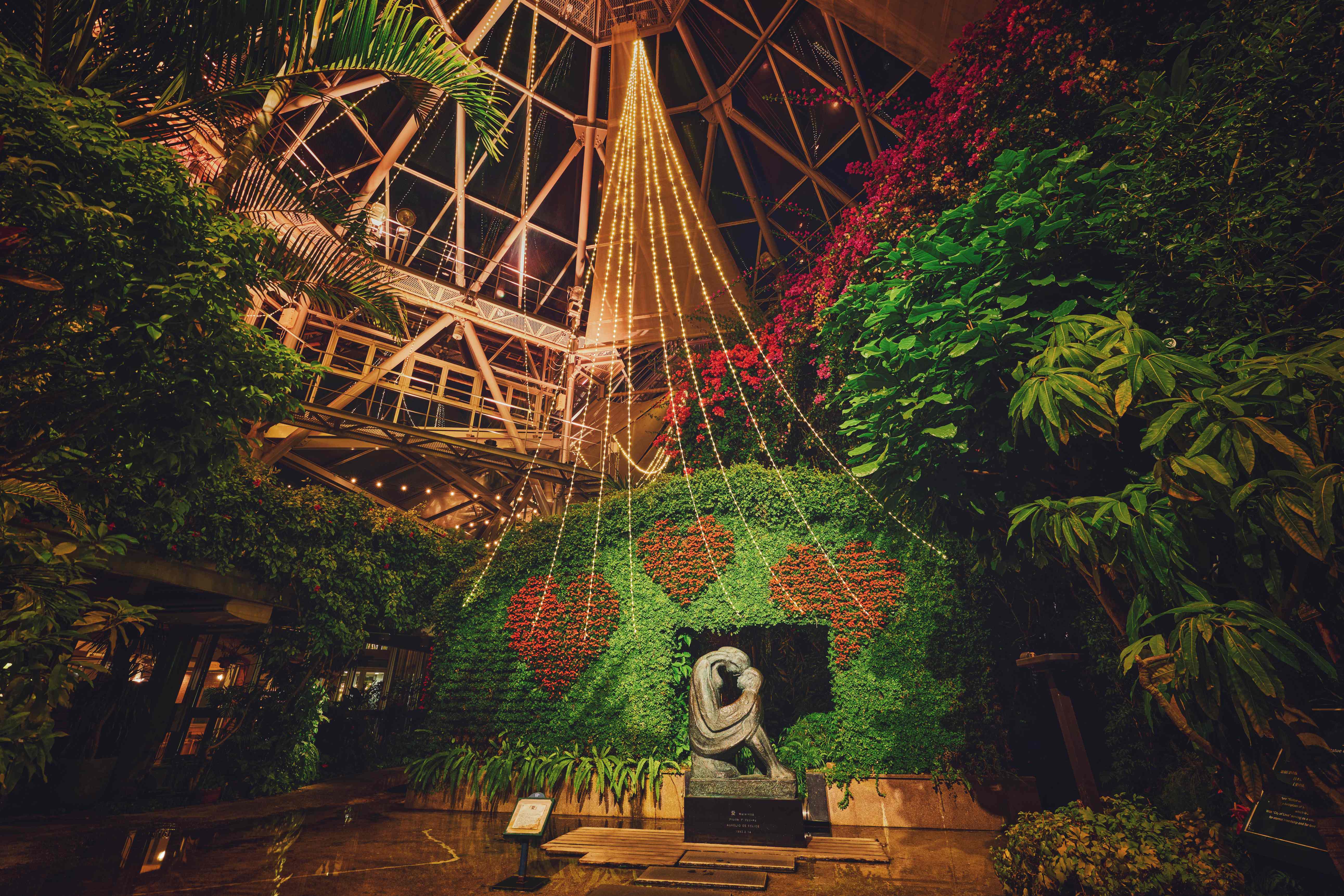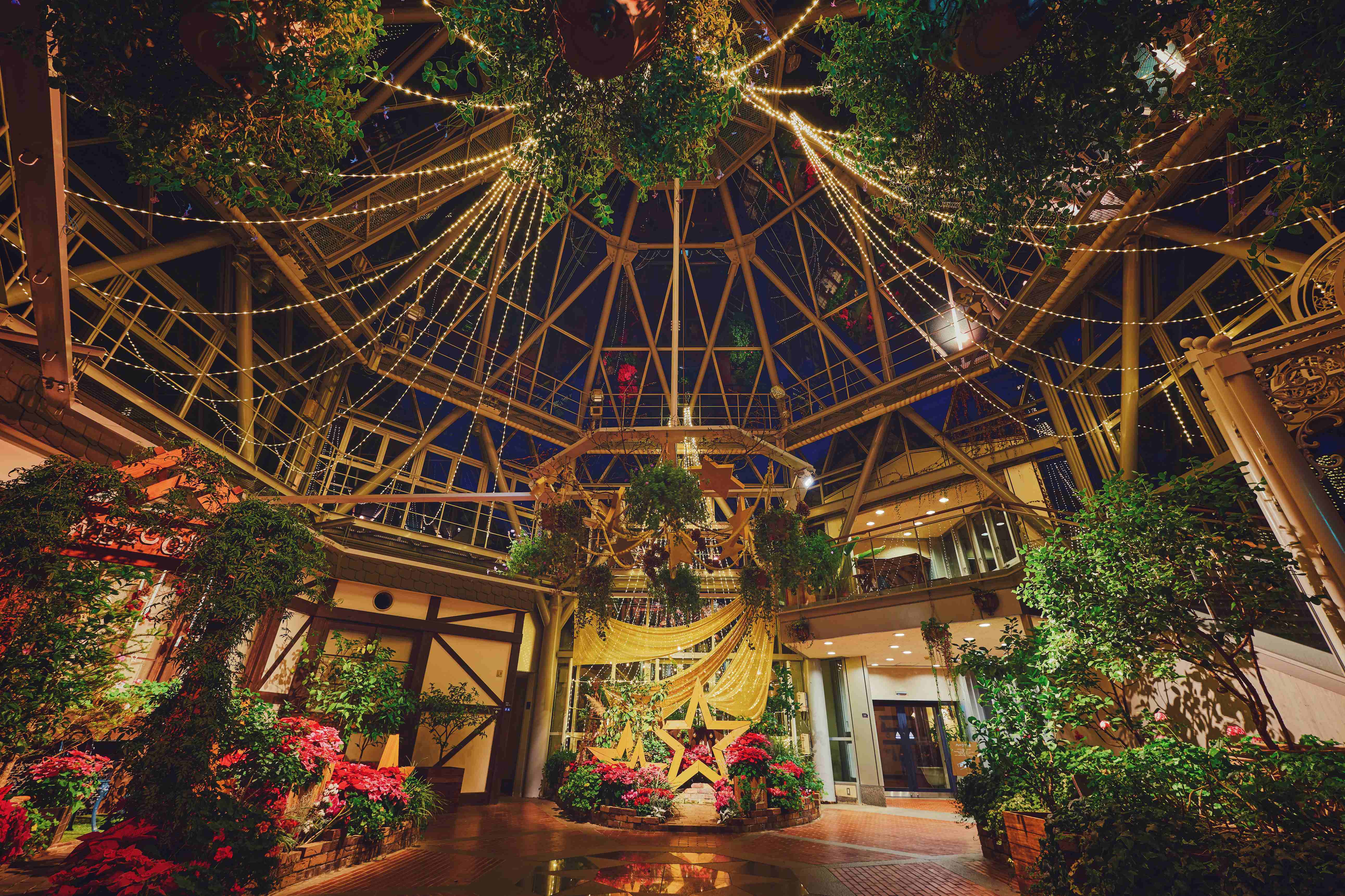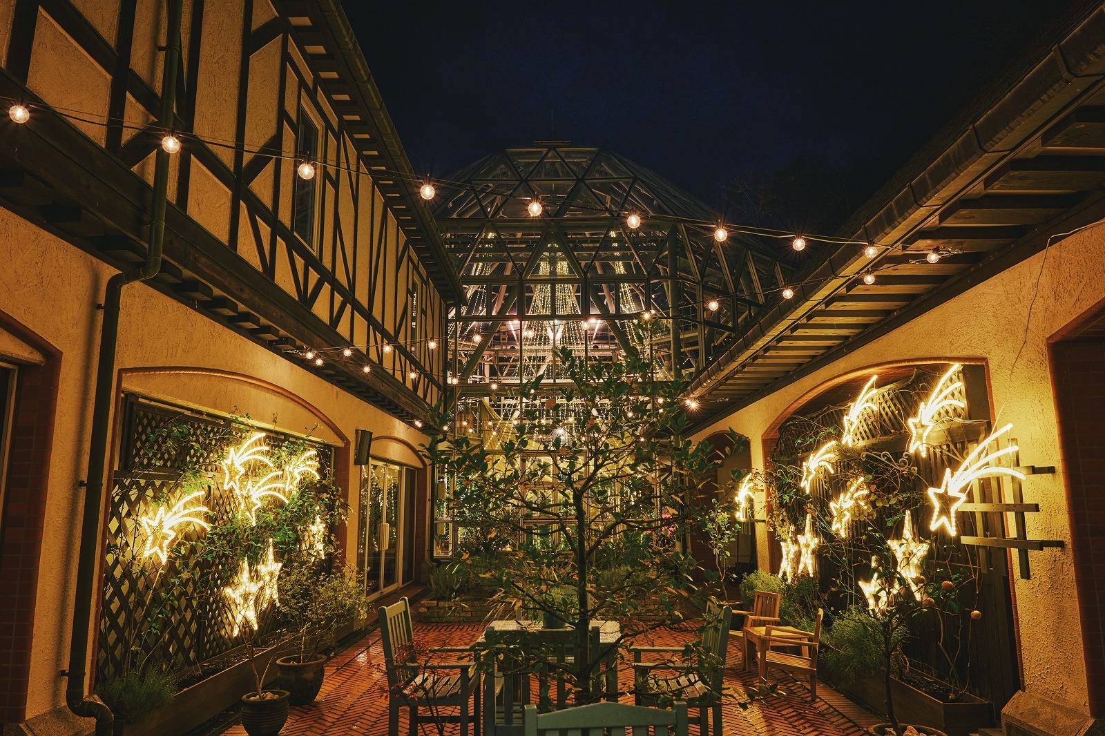 4つのガラス張りのドームが煌めき、森の中に浮かびあがります。クリスマス特別ナイター営業時は、グラスハウスエリアも特別ナイター営業を実施。エントランスや熱帯の植物が彩る温室、暮らしの展示スペース「ハーブの家」や中庭、その先に広がる特等席「ザ・ヴェランダ テラス」がイルミネーション空間に変貌します。