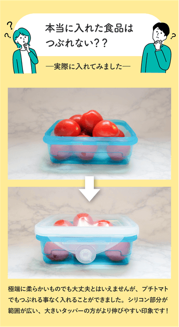 クレバーボックスの最大の特徴はシリコン素材の蓋が伸びること。食材の大きさを細かくカットし保存方法を考えなくても、タッパーに入れてしまえばタッパーが対応してくれます。