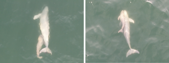 近畿大学農学部(奈良県奈良市)水産学科4年 野呂苑衣子(執筆当時)、同准教授 酒井麻衣、三重大学大学院生物資源学研究科(三重県津市)助教 八木原風、同博士後期課程3年 寺田知功(研究当時)、同博士後期課程2年 村山夏紀、同大学鯨類研究センター技術補佐員 神田育子、の研究グループは、ハクジラ類※1 の一種であるスナメリ※2 を三重県津市町屋海岸にてドローンで撮影し、野生スナメリの子どもと成体が並んで遊泳する行動を観察しました。その結果、子どもと交代で並泳する成体の存在を確認し、野生のスナメリにおいて初めて、子どもと親でない成体(非親個体)の社会行動を明らかにしました。本研究成果から、スナメリはこれまで考えられていたよりも、高い社会性をもつ可能性が示唆されました。