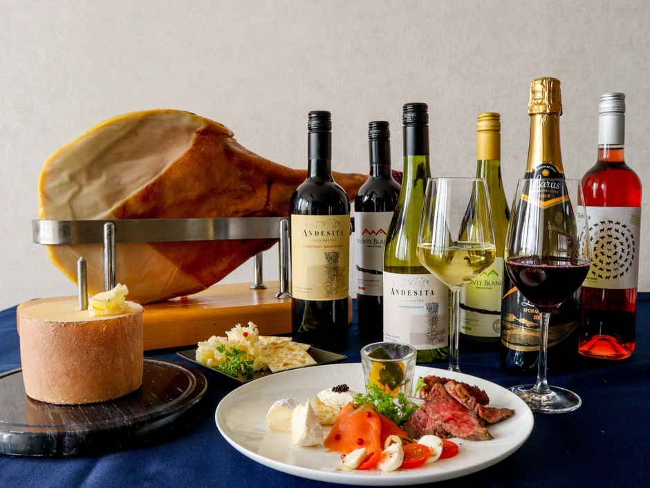 ボージョレ・ヌーヴォーのほか、ソムリエおすすめワイン6種をブッフェスタイルでご用意する本イベント。ワンプレートオードブルや原木生ハム、フリル状に削って味わう濃厚チーズ「テット・ド・モワンヌ」でお好みのワインとのマリアージュをお愉しみいただけます。