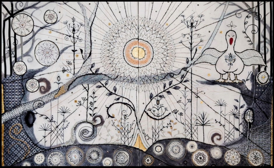 本展では、自身が創案した独自の表現技法「幾何学刺繍+墨アート」による新作を発表いたします。