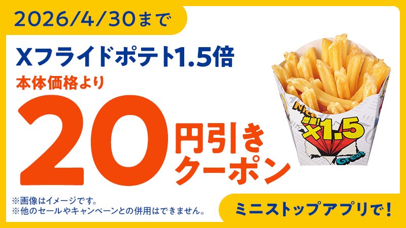 ミニストップは、ゴールデンウィークに合わせ、恒例の「対象のソフトクリーム本体価格より50円引」のセールをはじめとした、おトクなセールを実施いたします。「Xフライドポテト」は、お値段そのまま、1.5倍に増量中!「ベルギーチョコパフェ」や、「無限くりーむ」等、人気のチルドスイーツも、期間限定で本体価格から20円引のセールを開催します。