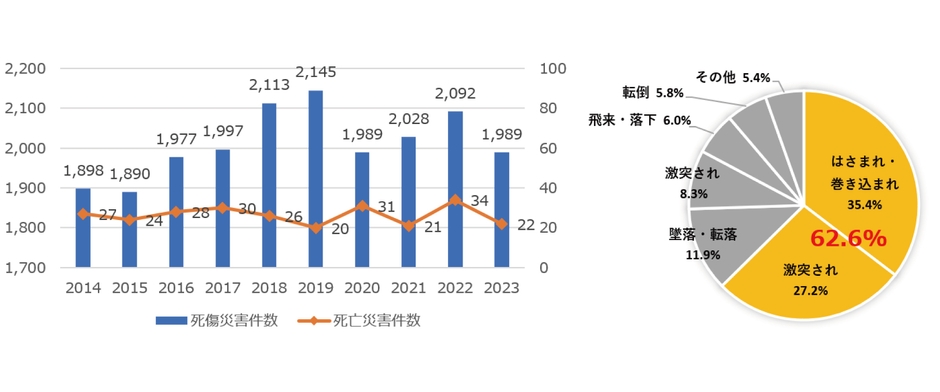 厚生労働省の統計によると、フォークリフトに関連する労働災害は毎年約2,000件発生しており、そのうち「はさまれ・巻き込まれ」や「激突され」など、人との接触事故が62.6%を占めています(厚生労働省労働災害統計より)。人材不足やオペレーターの熟練度低下が進む中、こうした事故の抑制は年々難しくなっており、AIを活用した安全支援技術への注目が急速に高まっています。