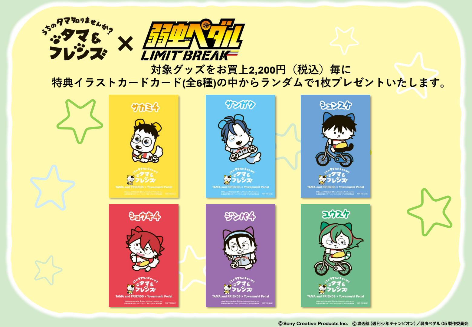 さらに『タマ&フレンズ』×『弱虫ペダル』コラボレーショングッズをお買上2,200円(税込)毎に特典ポストカード(全6種)の中からランダムで1枚プレゼントいたします。
