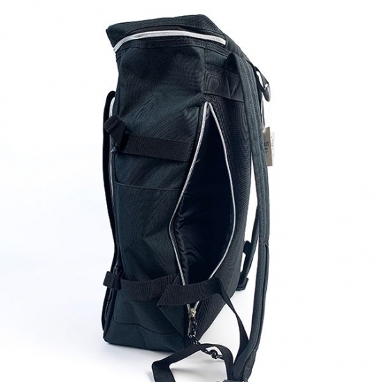 ドカンとあいてます。何を入れるかというと、なんでも入りそう。ボックスタイプなので無駄なくたっぷり収納できます。このガバっとした開き方の出しやすさは鬼。左右にはそれぞれ大きなサイドポケットも付いています。背中部分にもポケットがついているので収納しやすく、フロントポケットも大容量☆