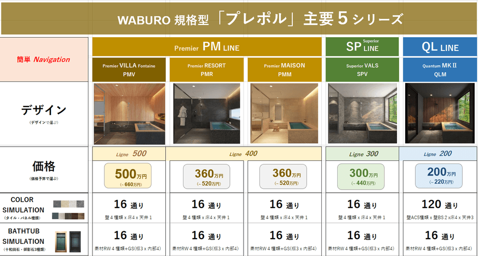 画像カラーシミュレーションとあわせて、本体選択(シリーズとサイズで200~500万円台)+主要Optionを選んでいただくことで、シミュレーション後に「簡単予算見積書」が生成されます。規格型でありながら、唯一無二の「自分仕様」のバスルーム仕様の画像シミュレーションと概略見積書が完成します。