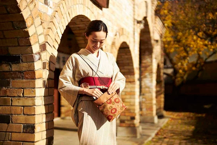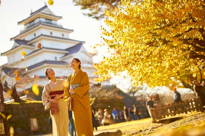 散策の際は、鶴ヶ城周辺の着物レンタルショップで会津木綿の着物に着替えます。当プラン限定で散策用に柿渋染めのバッグを用意しており、会津と渋柿にちなんだ「シブい」装いで散策に出かけます。