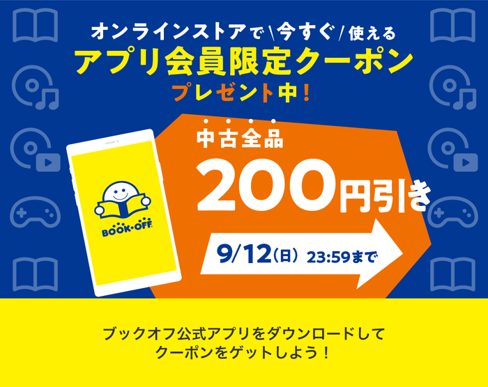ブックオフ公式アプリ会員限定 オンラインストアで使える200円引きクーポン プレゼントキャンペーンを9/1(水)~9/12(日)実施