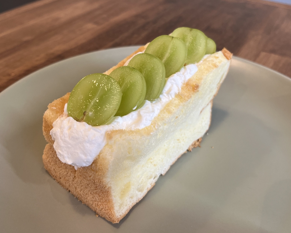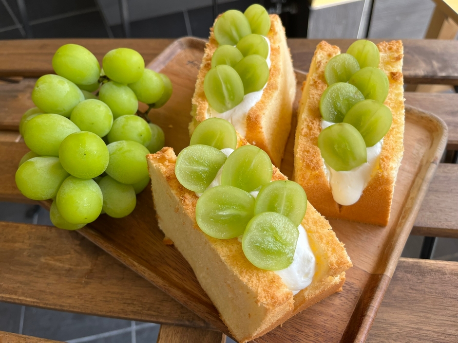 一般的な食パンを使用したフルーツサンドとは異なり、シフォンケーキでサンドすることで、よりふわふわな食感をお楽しみいただけます。今回、旬のフルーツ“シャインマスカット”を使用しています。