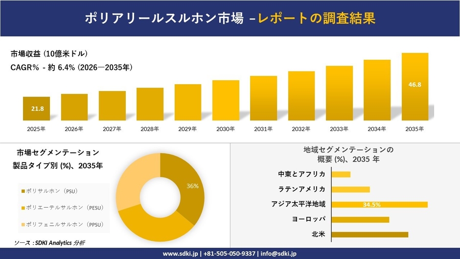 提出日 (2026年03月06)、SDKI Analytics(本社:渋谷区、東京都)は、2026年と2035年の予測期間を対象とした「ポリアリールスルホン市場」に関する調査を実施しました。