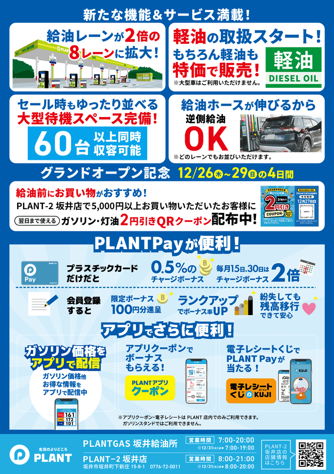 ・PLANT-2 坂井店合同キャンペーンとして、税込5,000円以上お買い物いただいたお客様に、翌日まで使える2円/L引き二次元コードクーポンを配布