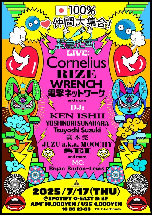 タイトルは【 100% 仲間大集合!Bye-Bye Bryan 】日程は2025年7月17日(木)、18~23時。で会場は渋谷@Spotify O-EAST & 3F。東間屋でアフターもあります!ホストMCはもちろんブライアン・バートンルイス。番組形式で出演者もしっかり紹介するよ。