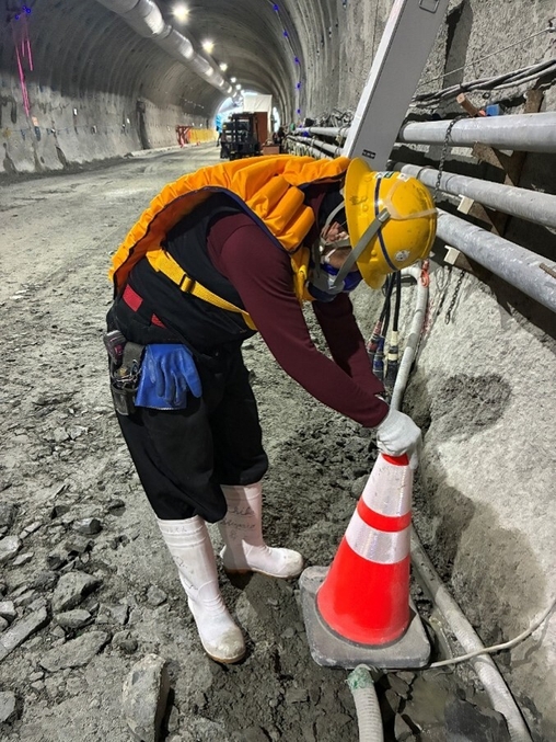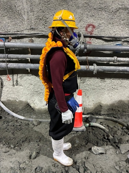 山岳トンネルの施工は、高湿度・高温度な閉鎖空間での作業となり熱中症発症リスクが高いため、冷房設備や換気、冷風発生装置等による対策が不可欠であり、WBGTのモニタリングや適切な休憩、水分・塩分補給、ファン付き作業着の着用で予防しています。一方で、切羽作業に従事する作業員は、肌落ち(岩石の落下)による重篤な労働災害を防ぐためバックプロテクターを着用していることから、ファン付き作業着の着用が難しく、着用可能な場合でも、「発破作業時の誤爆対策のため電気製品を避ける」「ファン式の作業着は衣服の中に粉じんを呼び込む」等の問題から、電動式のファン付き作業着を着用することは困難です。