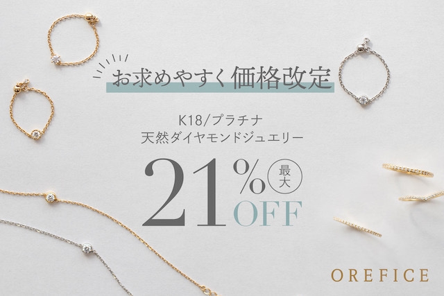 株式会社ジュエリー工房Orefice(所在地:東京都港区、代表取締役社長:中村 誠)が展開するジュエリーブランド「オレフィーチェ」は、2023年11月8日(水)より、展開するK18(18金)/プラチナ製品のうち13商品を最大21%値下げいたしました。