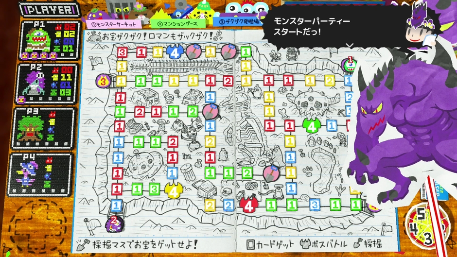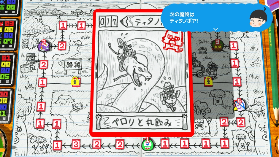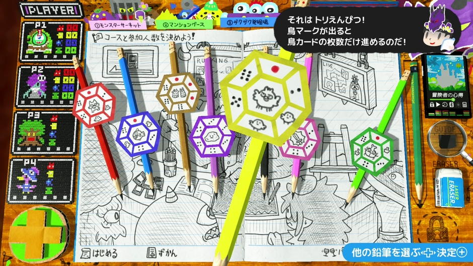 プレイヤーはキャラクターと鉛筆サイコロを選択して、すごろくを進め、魔王バッジを集めていきます。