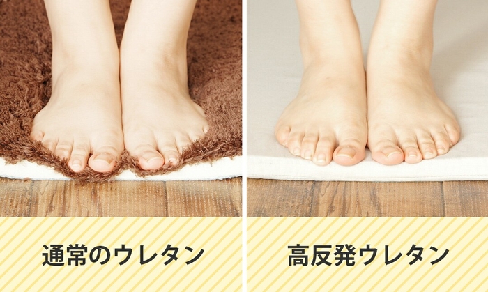 一般の弾力性のあるラグ、いわゆるウレタン入りラグに使用されている素材と違い、「ごろん」は、高反発ウレタンを使用しています。