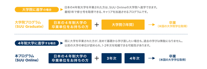 すでに日本の大学を卒業している場合、日本の大学で取った単位をSUUに移管し、4年の学部課程を2年に、2年の大学院課程を1年に短縮できる可能性があります。つまり学士号は最短2年、修士号は最短1年で取得可能。仕事と学習を両立する期間を短くし、負担を減らします。