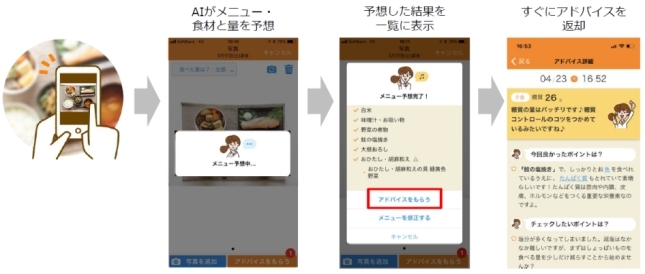 AI画像認識により、食事の写真を撮るだけでメニューや食材、食事の量を自動認識してアドバイスを提供する「写真を撮るだけでアドバイス」を実現しました。日本初※の3つの機能『食材の自動認識』『食事量の自動認識』『画像に対する自動アドバイス』が組み合わされています。