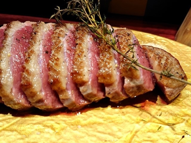 フォアグラを採取するために飼育した鴨でございます。長期間の飼育と栄養が高い餌を与えております。その分一枚の鴨ロースの大きさは通常の鴨ロースの約1.5倍大きいです。さらに凍結方法にもこだわりがあって、コストの高い窒素凍結を用いてまして、フレッシュな状態に近い品質を保っております。