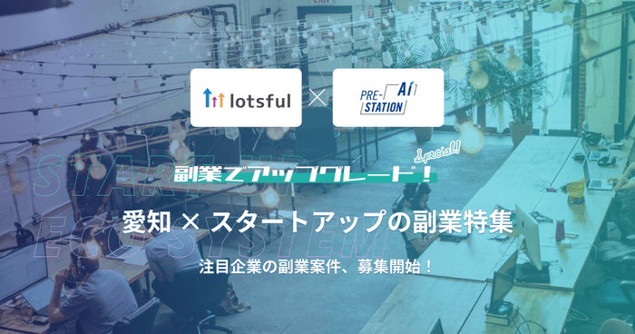 総合人材サービス、パーソルグループのパーソルイノベーション株式会社(本社:東京都港区、代表取締役社長:長井 利仁)が運営する副業人材マッチングサービス「lotsful(ロッツフル)」(https://lotsful.jp/)は、2021年4月に開設された、愛知県のスタートアップ支援拠点「プレ・ステーションAi」と連携し、入居スタートアップを支援する副業人材の募集を開始いたします。本募集は、『lotsful × プレ・ステーションAi 愛知×スタートアップの副業特集(https://lotsful.jp/specials/upgrade9-aichi-startup)』と題し、キャリアのアップグレードにつながる副業案件を集めた『副業でアップグレード!』の特設ページにて、4社12プロジェクトを2021年9月16日(木)より一挙公開しました。