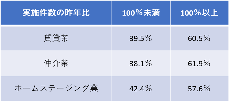 仲介業では契約件数や内見数が減ったという回答が多くありました。対面営業ができなくなったことで、バーチャルホームステージングやホームステージング物件を3D動画撮影をしたり、WEB内見を導入する会社が増えました。
