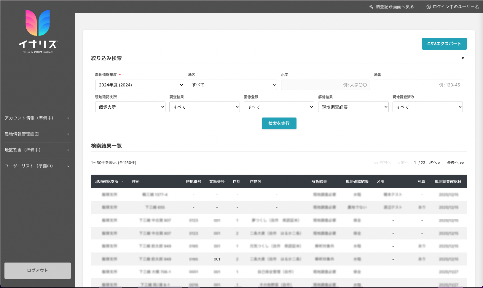 また、「管理者向け機能」では農地台帳情報の一覧表示やエクスポートができるため、農地台帳システムへの現地調査結果の入力作業も大幅に効率化できます。
