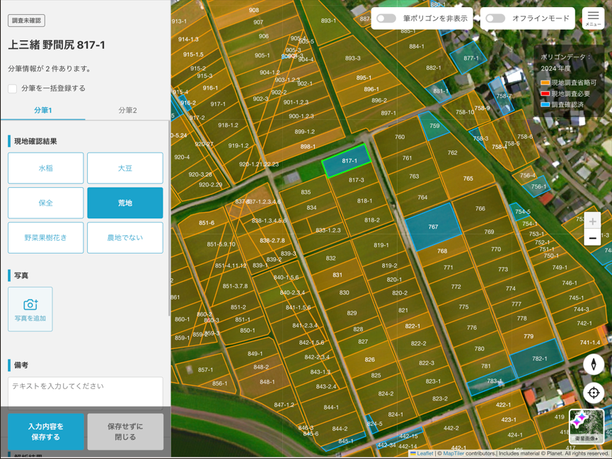 イナリスの「現地調査向け機能」では、「農地の利用状況(管理状況や作付け品種)」を直接記録できるため、現地調査をタブレットひとつで完結できます。