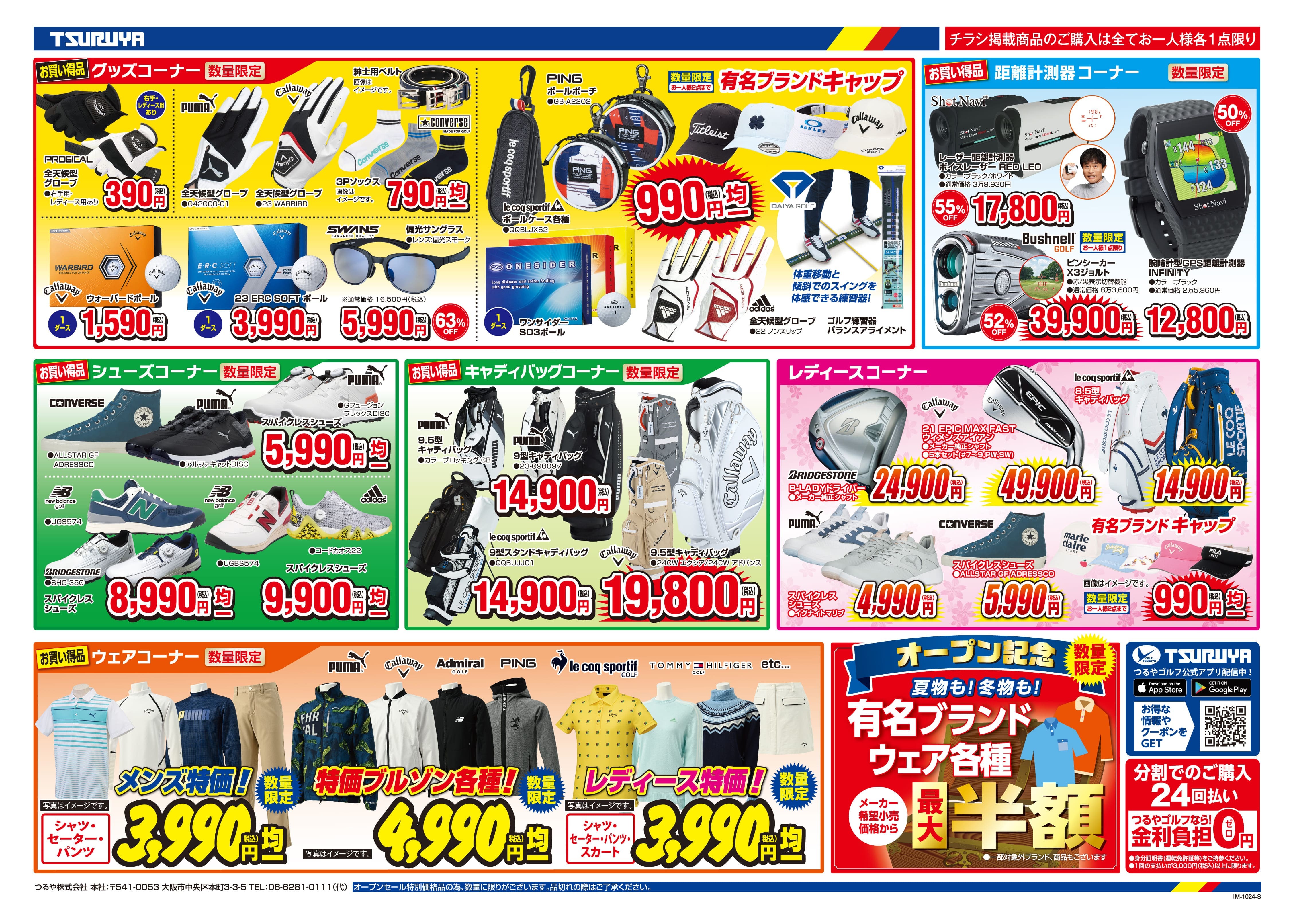 また、10月16日(木)から10月22日(水)限定で、全品dポイント5倍キャンペーンを実施、さらに、10月16日(木)から10月19日(日)は、10,000円以上お買い上げの方に有名ブランドボール2球を各日先着50名の方にプレゼントいたします。さらに、つるやゴルフの新しいポイントサービス「つるやポイント」も貯まります。ぜひご利用ください。