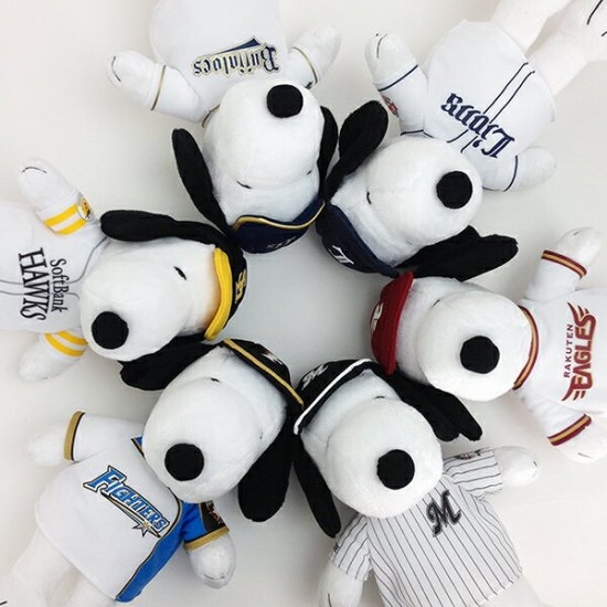 プロ野球コラボの、スヌーピーぬいぐるみです。球団のユニフォーム姿のスヌーピーが、とっても可愛いですよね。
