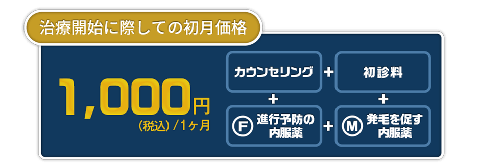 上記の初月特別価格のほかに、2ヶ月目以降は髪の毛を維持する治療が税込2,000~7,150円/月、そして髪の毛を生やす治療が税込9,700~19,250円/月となります。また必要な方には血液検査(税込5,500円)を、ご希望の方にはノーニードル育毛メソセラピー(税込19,800円)、AGA遺伝子診断(税込19,800円)などお受けいただくことも可能です。ただし、必要性のない方やご希望ではない方は必要ありません。